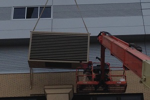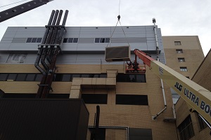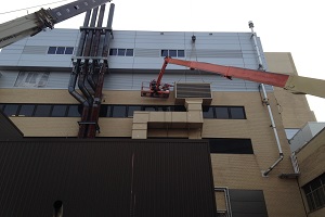 Pictured is the specialty louver installation and vent extension from existing facility (brown brick) beyond new construction (grey panel).